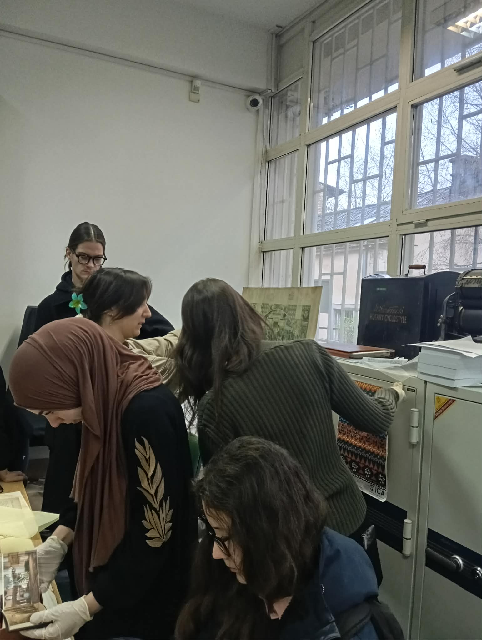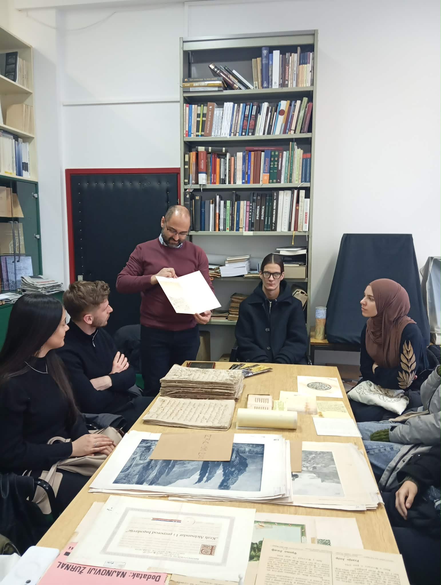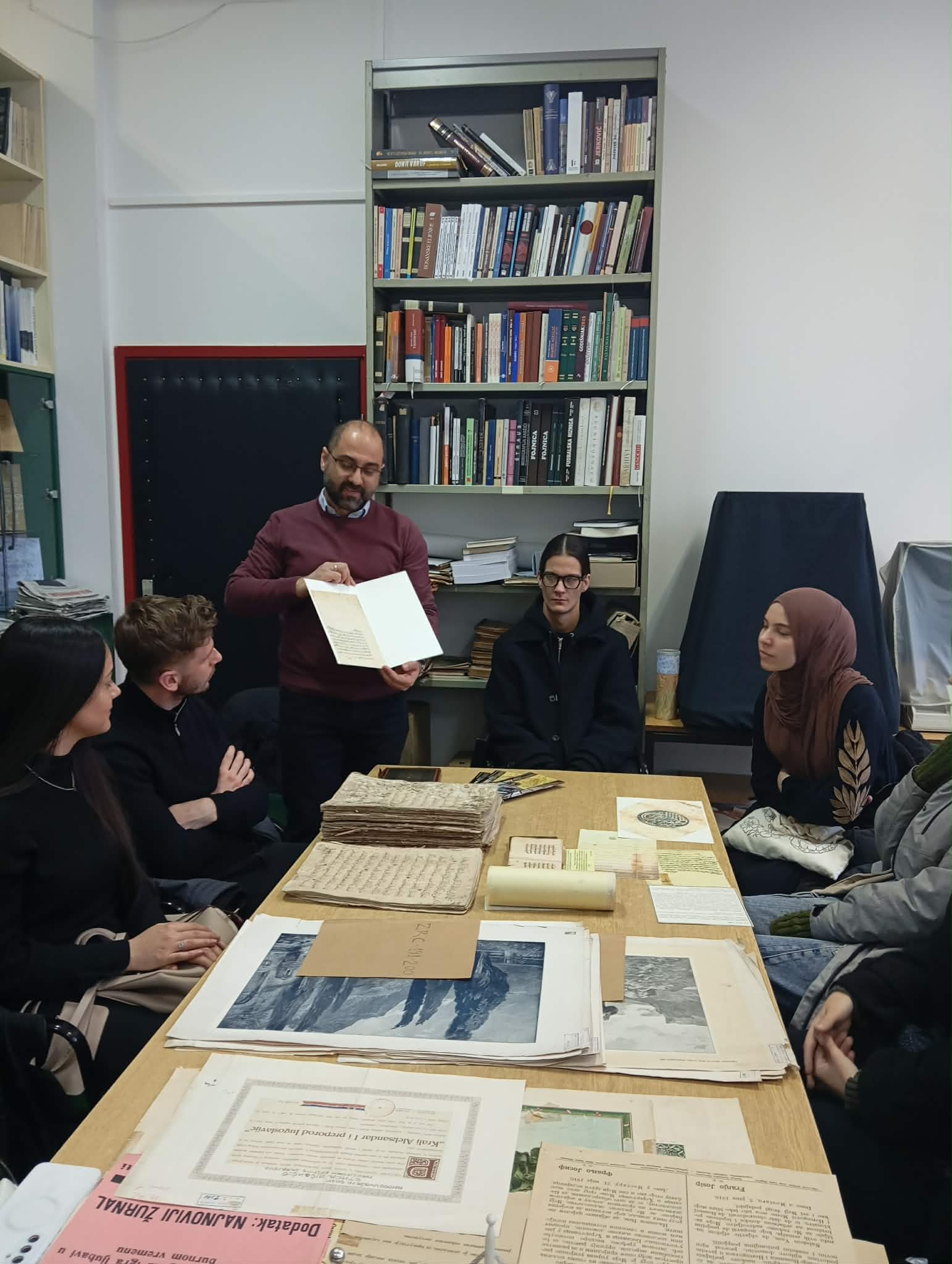 Studente su ugostili direktorica Arhiva Ismeta Džigal Berkovac, te više arhivistice Elma Dervišbegović i Almira Alibašić. Nakon pozdravnih riječi direktorice, one su studentima predstavile Arhiv i njegovo djelovanje, te dio iz bogate arhivske građe, naših fondova i zbirki. S obzirom na profil studenata, odlučili smo se za predstavljanje najviše eksponata iz naših Zbirki: Orijentalne, Zbirke plakata, Zbirke reprodukcija i crteža, Zbirke forografija i razglednica, te Zbirke karata. Studenti su čak mogli vidjeti i original našeg najstarijeg datiranog dokumenta – Emer‑namu Gazi Husrev‑bega iz 1532. godine (dimenzija 26,6 x 16 cm), izuzetno značajan dokument iz osmanskog perioda, koji svjedoči o društvenom, vjerskom i kulturnom životu Sarajeva u XVI vijeku. Ovo je jedan od dva dokumenta iz naše Orijentalne zbirke koja su uspješno restaurirana prošle godine.